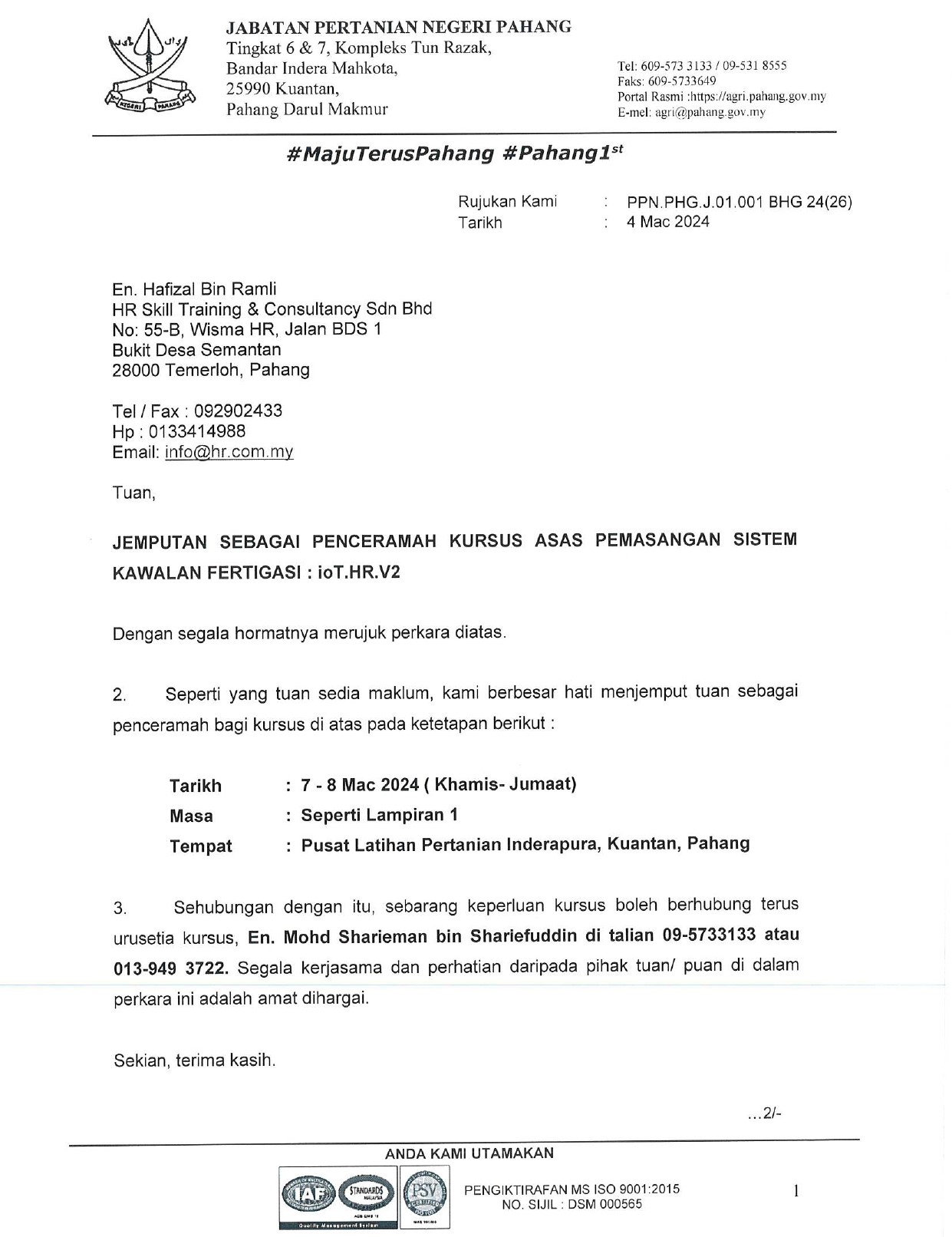 - Penceramah Kursus Asas Pemasangan Sistem Kawalan Fertigasi : ioT.HR.v2 Siri 2024 – 23 & 24 April 2024