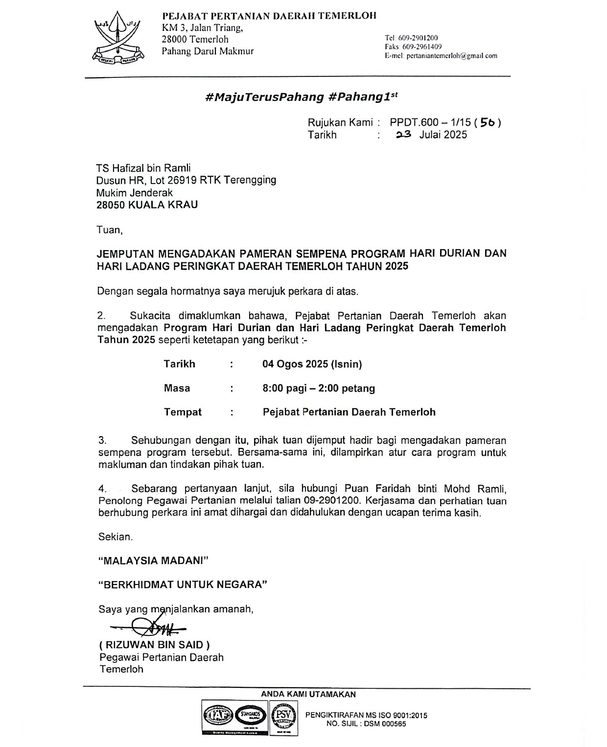 - Sijil Konvensyen Kumpulan Inovatif & Kreatif Sektor Awam (KIKSA) Pahang dan Hari Inovasi Peringkat Negeri Pahang 2024