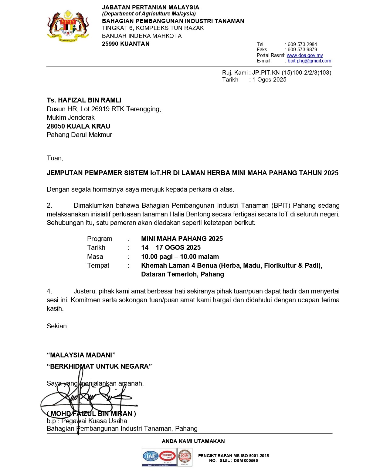 - Johan Pertandingan Inovasi Pertanian 2024 (Kategori Petani) – Baja Fertigasi HR