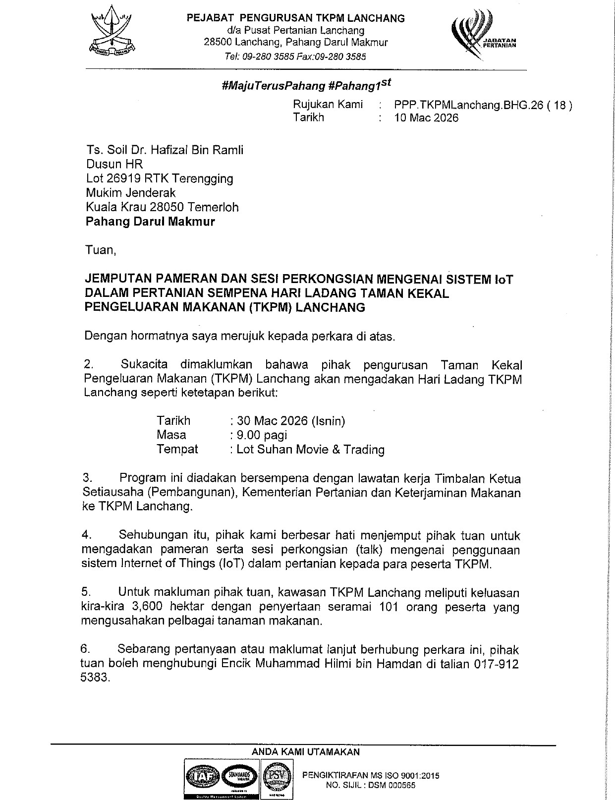 - Penceramah Kursus Asas Pemasangan Sistem Kawalan Fertigasi : ioT.HR.v2 Siri 2024 – 23 & 24 April 2024
