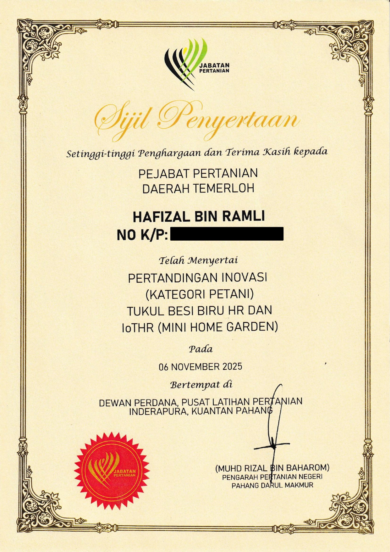 - Sijil Pertandingan Inovasi (Kategori Petani) Tukul Besi Biru HR & ioTHR (Mini Home Garden) – 6 Nov 2025