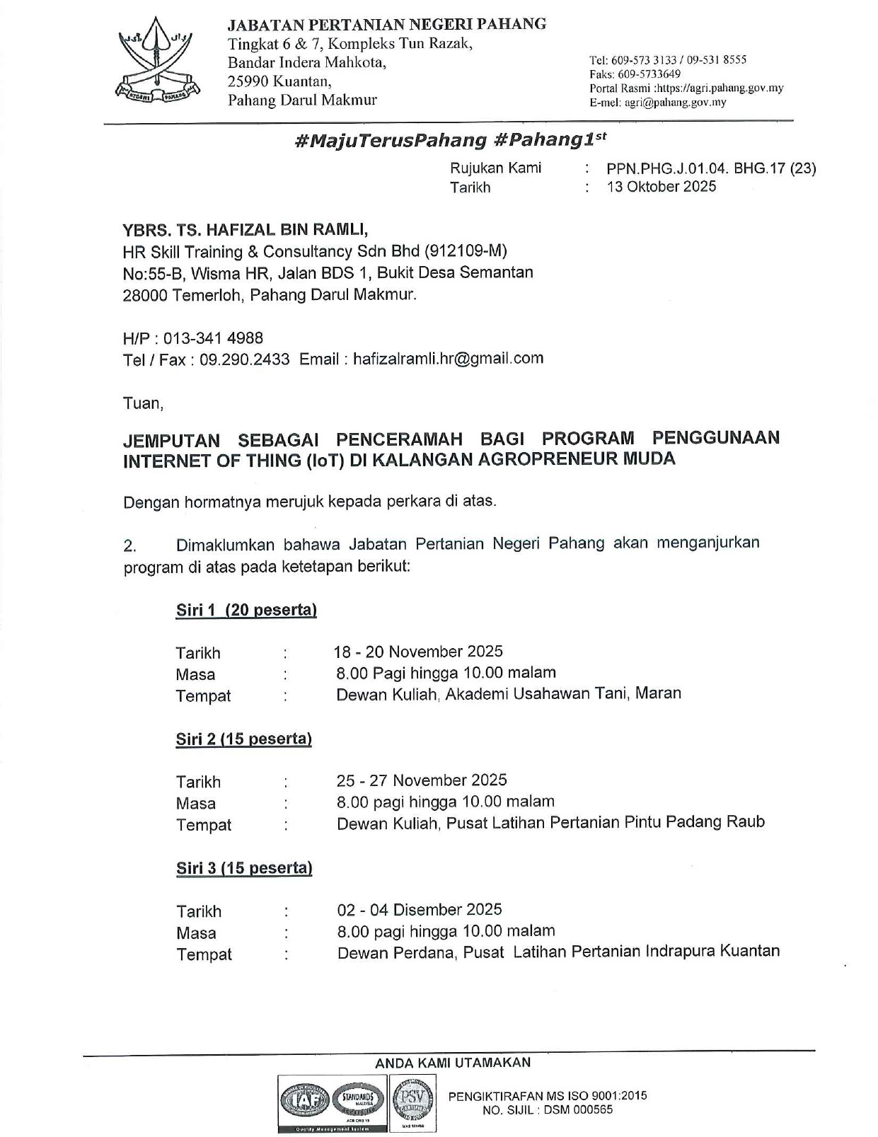 *Penceramah Jemputan Kursus Teknikal Pertanian, Jabatan Pertanian Negeri Pahang