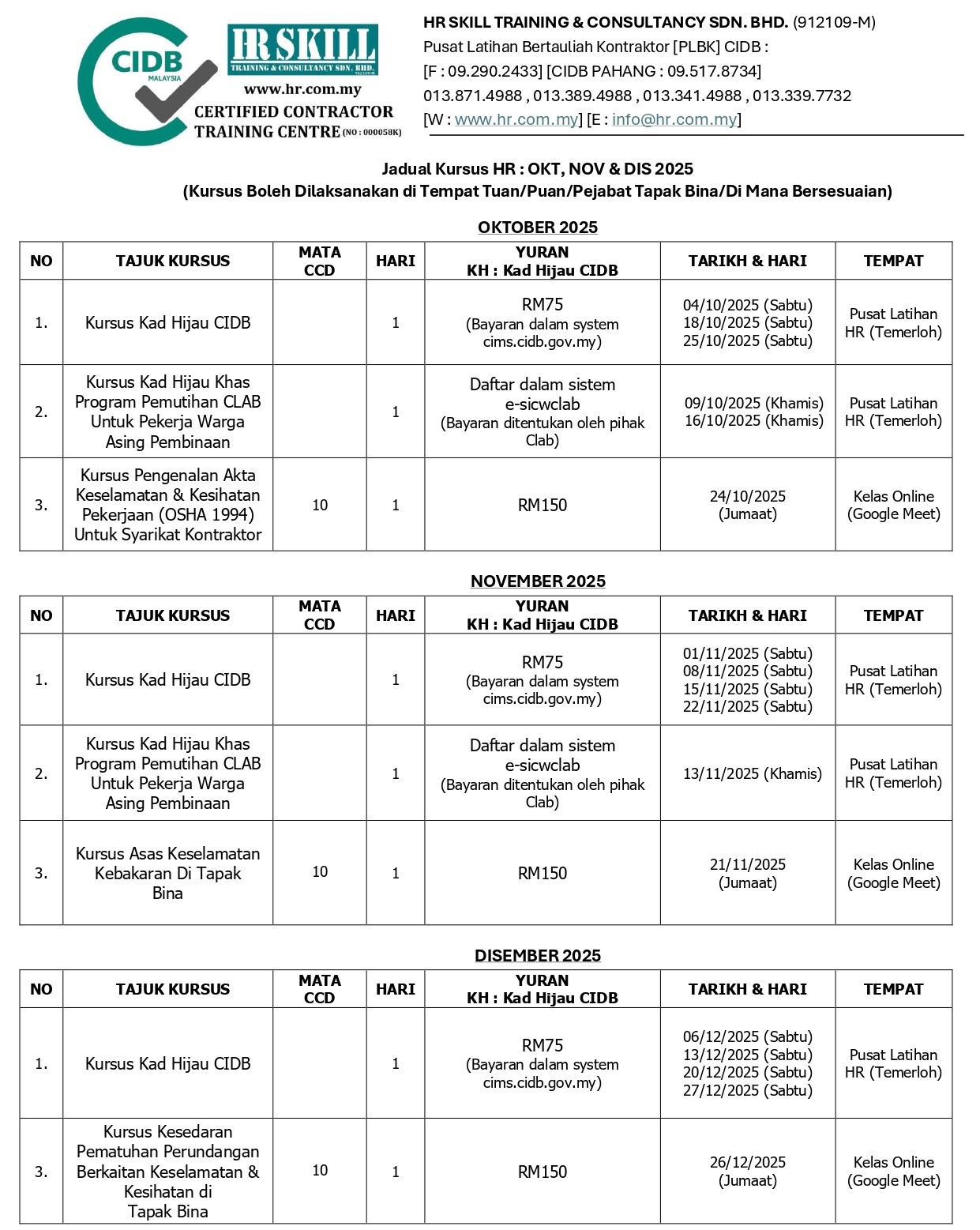 Emel Borang Penyertaan Kursus & Bukti Bayaran ke : kursus@hr.com.my